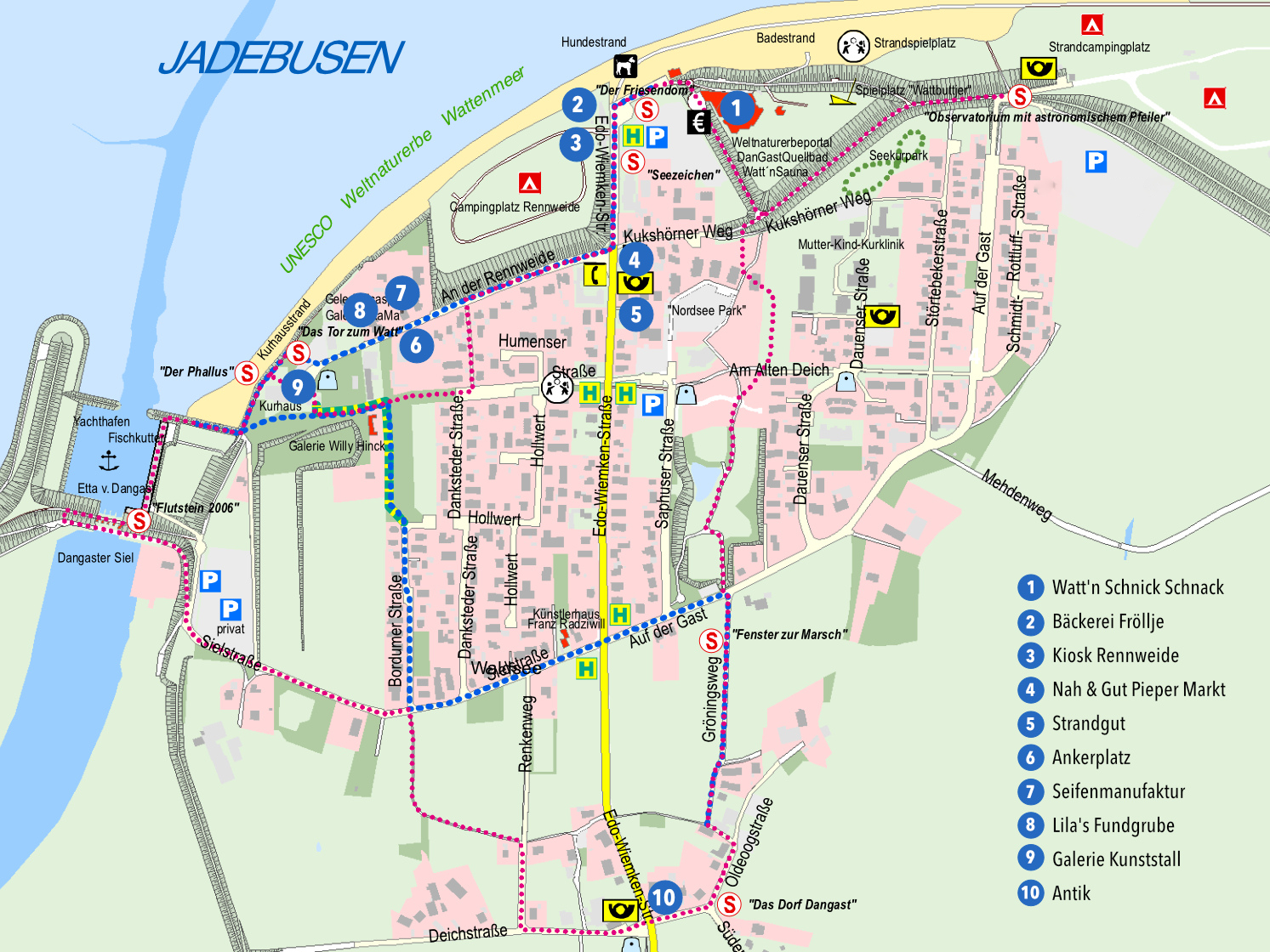 In Dangast gibt es zwar keine Fußgängerzone, aber einige kleine Läden mit einem vielfältigen Sortiment: von den klassischen Nordsee-Souvenirs, über Schmuck & Accessoires bis hin zu handgemachten Seifen und Marmeladen.