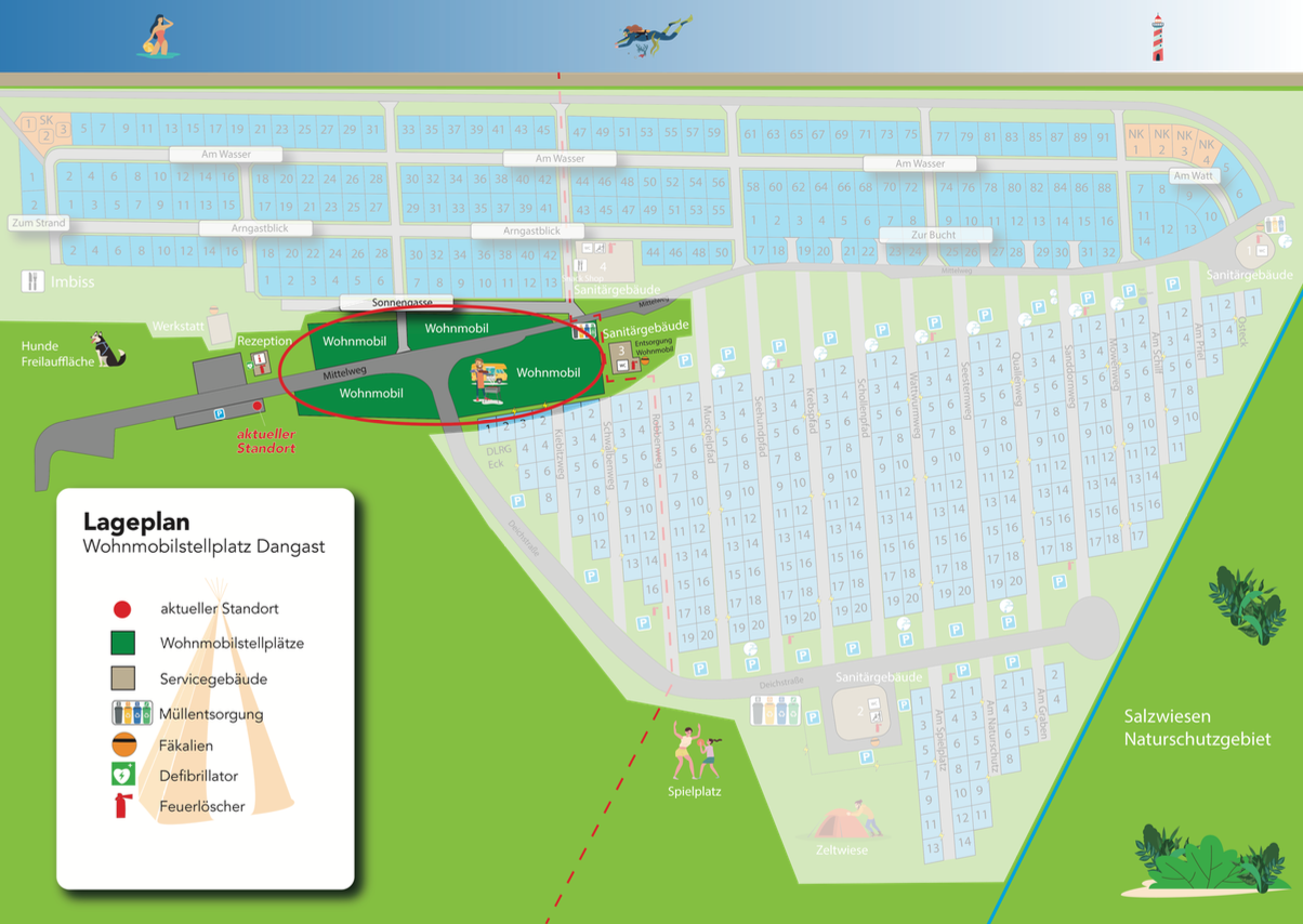 Der Winter-Wohnmobilstellplatz auf dem Strandcampingplatz in Dangast liegt direkt an der Wasserkante des Jadebusens. Wind und salzhaltige Luft prägen das raue Nordseeklima, das zusammen mit Deich, Weite und wechselnden Lichtverhältnissen die besondere Lage ausmacht.